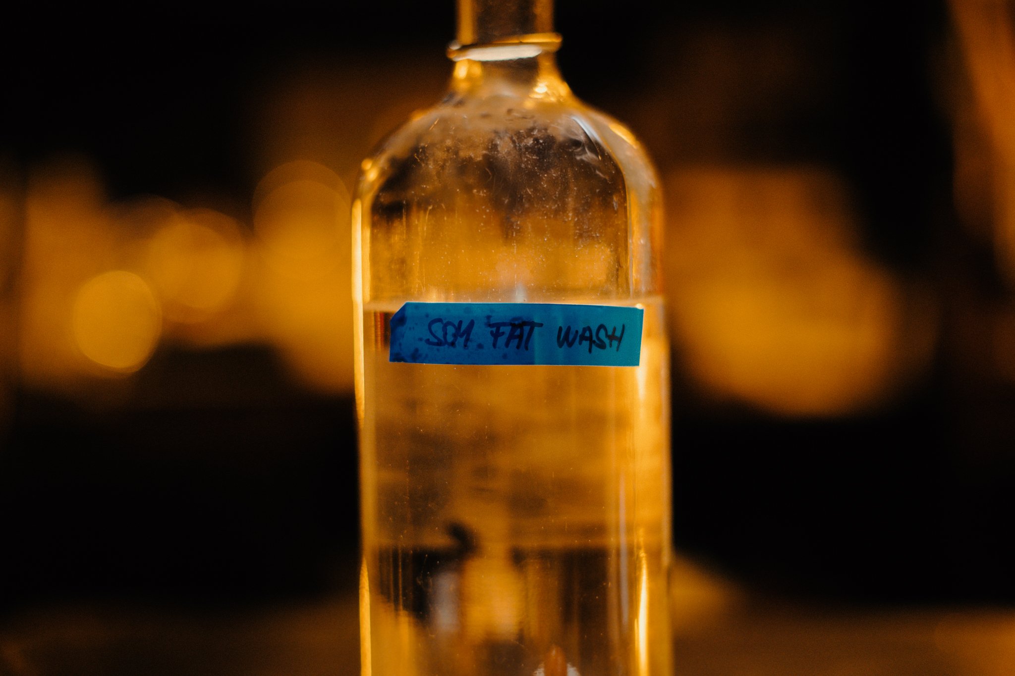 Fat-wash is a technique where a spirit is mixed with fat — butter, oil, bacon grease, or in our case, plant-based yogurt — allowing the alcohol to absorb its aroma and texture. When the fat is later removed, the spirit remains clear, delicate, and richly flavored.